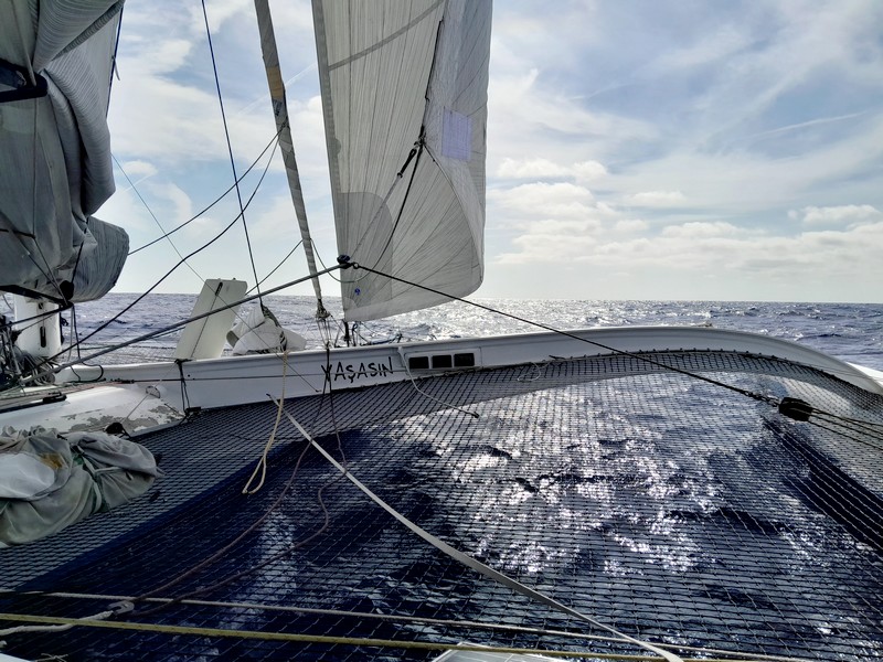 Nous larguons donc les amarres en milieu d’après-midi par 20 nœuds de vent, au portant. Cinq minutes après le départ, nous découvrons que l’émetteur-récepteur AIS (qui nous permet de voir les positions et directions des autres bateaux sur la cartographie, mais aussi d’être vus par eux) ne fonctionne pas, il n’a visiblement pas été vérifié. Bon. Je suis concentré, dans le moment, m’imprégnant du bateau, ses différents systèmes, réglages et manœuvres, son comportement à la mer et au vent, sensiblement différent d’un monocoque. Une brise bien établie ponctuée de grains nous fait dévaler la mer de Marmara en quelques heures.