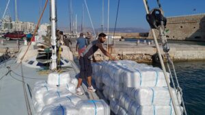 Le lendemain matin, après une profonde et à peu près complète nuit de sommeil, nos producteurs crétois arrivent pour charger Terre Exotique de ses précieuses épices. Une chaîne humaine se met en place et nous passons la matinée à charger de main en main, entreposer et matosser dans les soutes les 1700 kilos de d’huile d’olive, thym, origan et romarin.